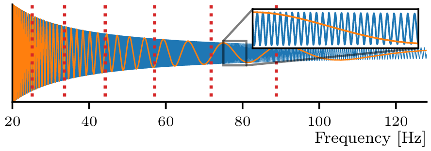 Together, heterodyning and multibanding greatly simplify the data and reduce its dimensionality. However, for heterodyning to work, the chirp mass \(\mathcal M\) in the formula above has to be close to the true chirp mass of the merger. But the chirp mass itself is unknown—and one of the parameters we aim to infer! We cannot simply choose an approximate \(\mathcal M\) and heterodyne in the same way across the entire prior volume.